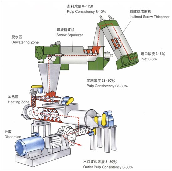 产品说明 盘式热分散系统主要包括斜螺旋浓缩机、螺旋加热器、喂料螺旋、盘式热分散机。分散浓度 25-30% ,可以满足 30-150T/D 产量要求 技术参数